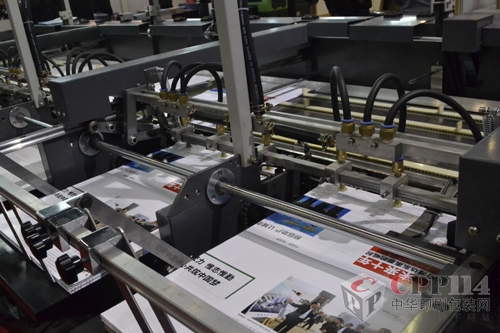 “這次展出的多聯(lián)配頁(yè)裝訂折頁(yè)一體機(jī),可以實(shí)現(xiàn)全自動(dòng)配頁(yè),裝訂,折頁(yè)功能,自動(dòng)化程度高,能幫助企業(yè)緩解用工勞動(dòng)壓力,實(shí)現(xiàn)一機(jī)頂幾人的工作量?!痹谡故镜谋姸嘈庐a(chǎn)品中,鄧顯才特別為筆者介紹了這款自動(dòng)化設(shè)備,“這樣一臺(tái)機(jī)器一人操作,一個(gè)小時(shí)2~3萬(wàn)張配頁(yè)量,可減少七八個(gè)勞動(dòng)力,現(xiàn)在工人難請(qǐng)用工困難,所以公司特別研發(fā)了這款替代人工的設(shè)備,現(xiàn)場(chǎng)展示效果很好,很受大家的關(guān)注。”